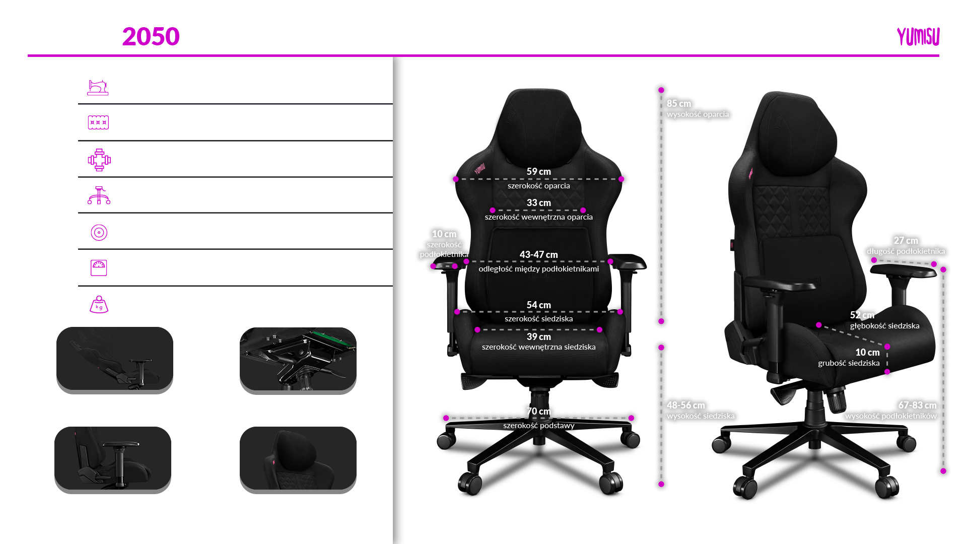 Każdy z modeli dostępnych w ofercie Yumisu to zakup na lata użytkowania. Z kolei my dbamy o to, aby każdy z elementów wchodzących w skład zestawów był dopracowany w najmniejszych szczegółach. Yumisu 2050 to wytrzymały stelaż ze stali osadzony na wytrzymałej a zarazem lekkiej aluminiowej podstawie. Siedzisko, a także oparcie to pianka formowana na zimno, która dostosowuje się do sylwetki siedzącego. Całość natomiast obszyta jest przyjemnym w dotyku, wytrzymałym materiałem (tkaniną).