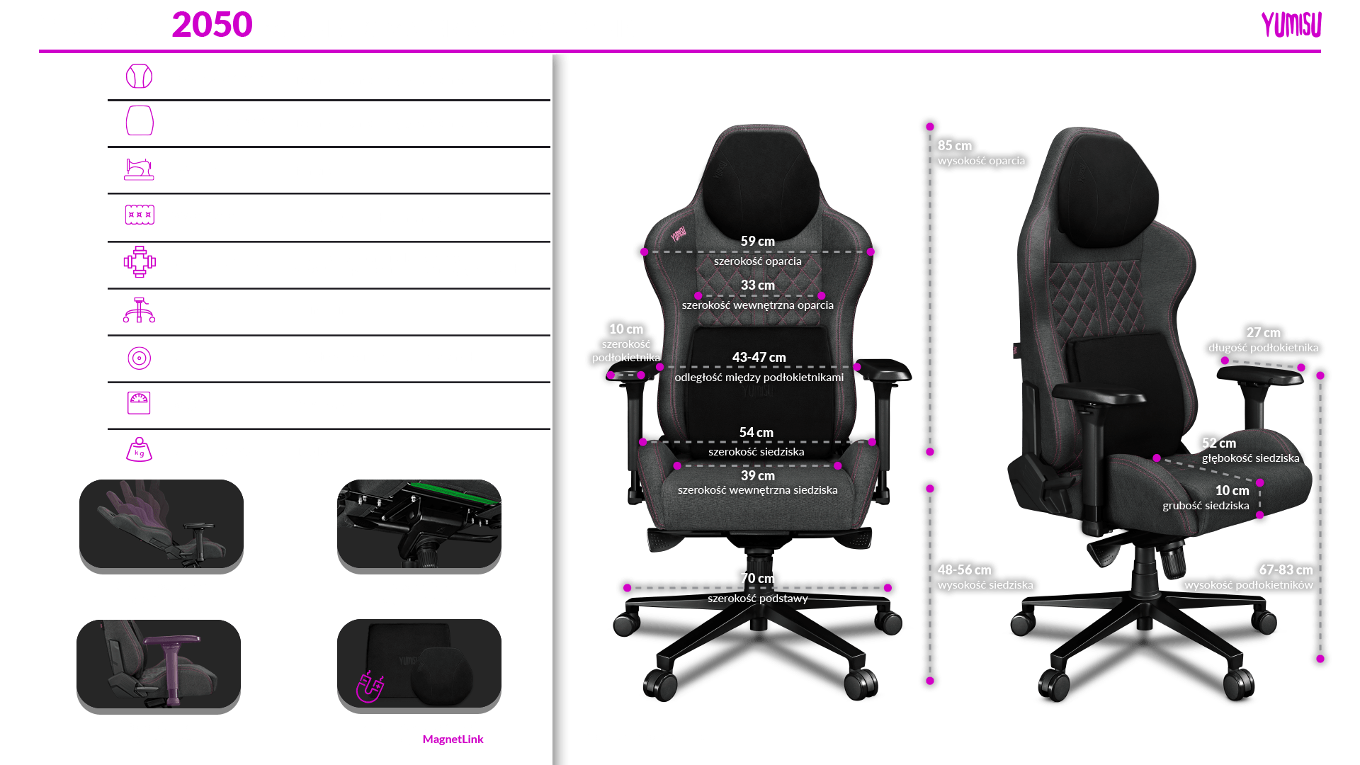MagnetLink, innowacyjna technologia marki Yumisu, rewolucjonizuje doświadczenie związane z montażem poduszek pod głowę, odcinka lędźwiowego oraz maskownic fotela. Dzięki niezwykłej mocy magnetycznej, łatwo dostosujesz pozycję poduszek, zapewniając sobie niezrównany komfort ergonomiczny.