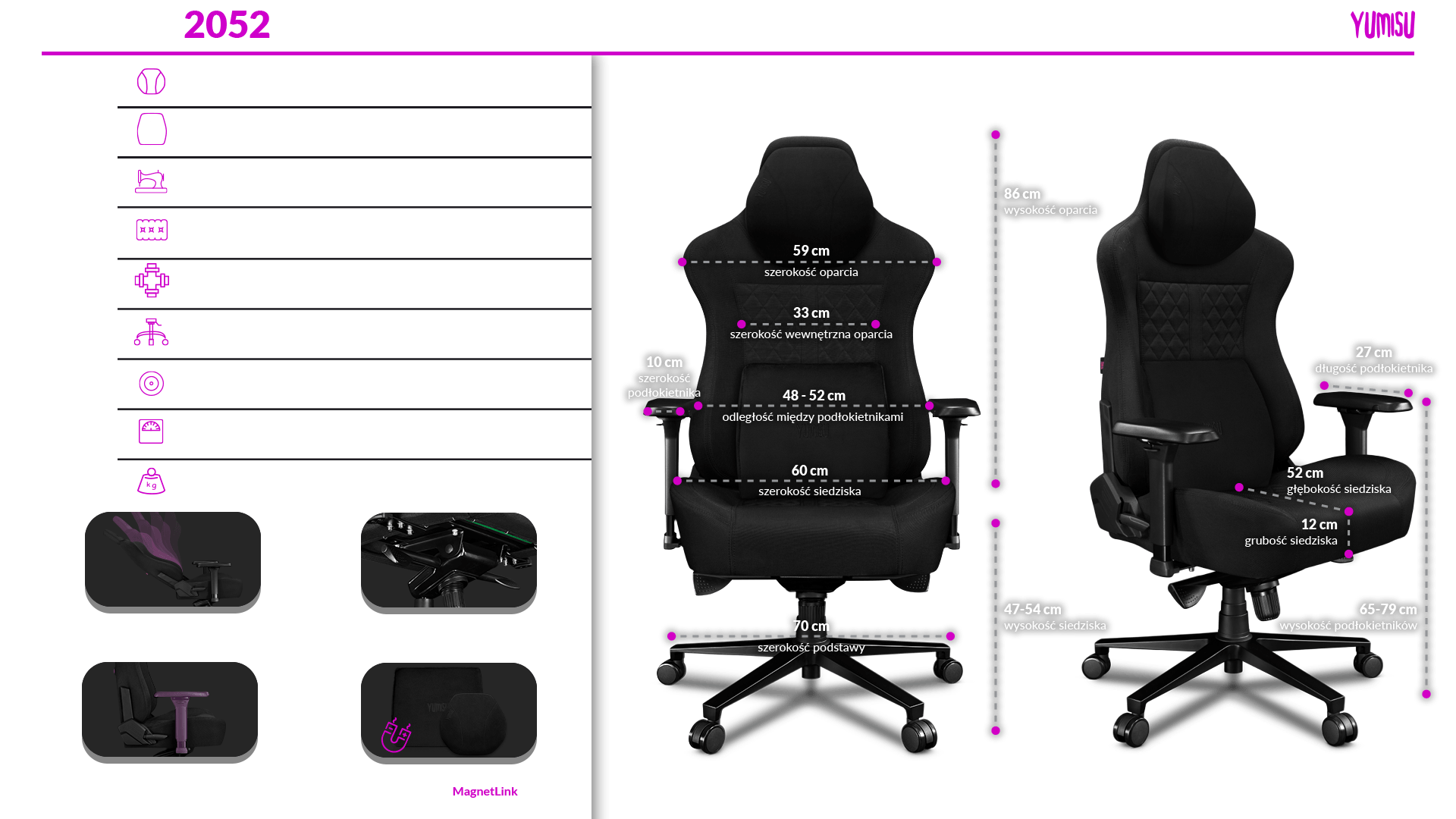 MagnetLink, innowacyjna technologia marki Yumisu, rewolucjonizuje doświadczenie związane z montażem poduszek pod głowę, odcinka lędźwiowego oraz maskownic fotela. Dzięki niezwykłej mocy magnetycznej, łatwo dostosujesz pozycję poduszek, zapewniając sobie niezrównany komfort ergonomiczny.