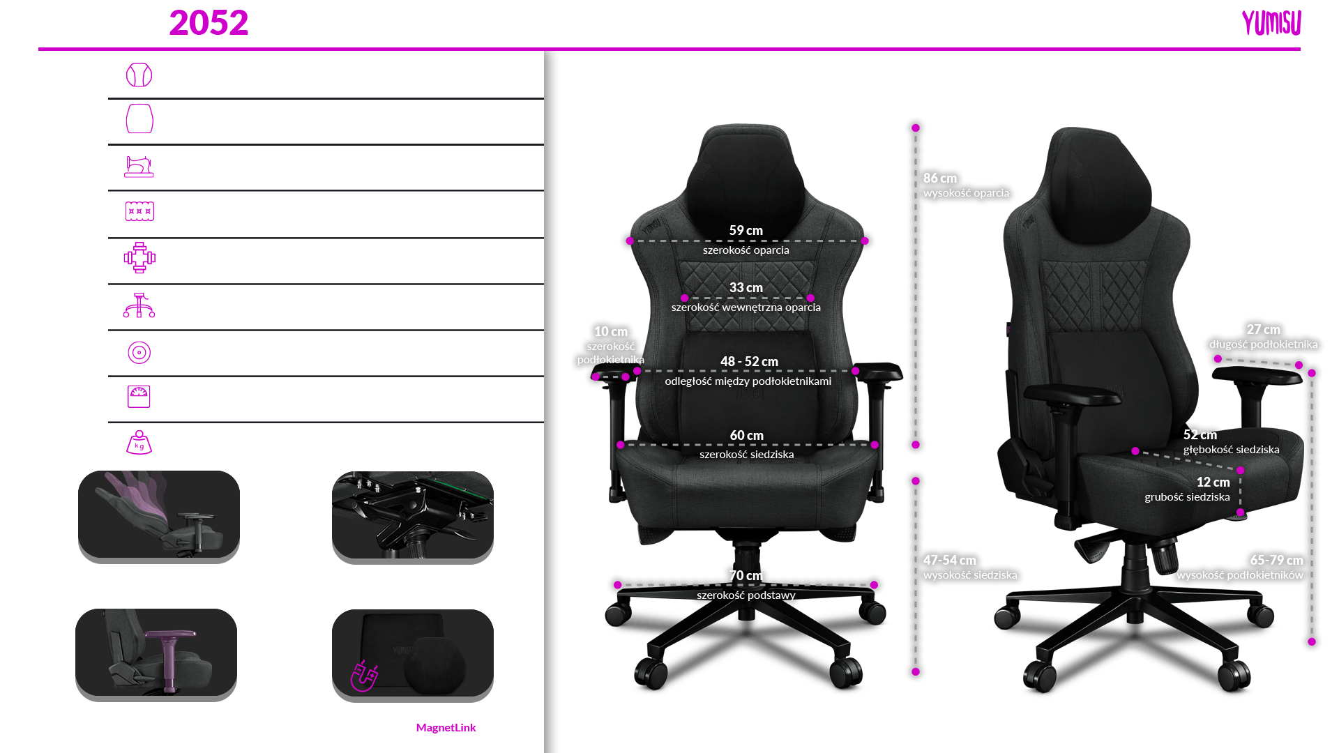 MagnetLink, innowacyjna technologia marki Yumisu, rewolucjonizuje doświadczenie związane z montażem poduszek pod głowę, odcinka lędźwiowego oraz maskownic fotela. Dzięki niezwykłej mocy magnetycznej, łatwo dostosujesz pozycję poduszek, zapewniając sobie niezrównany komfort ergonomiczny.