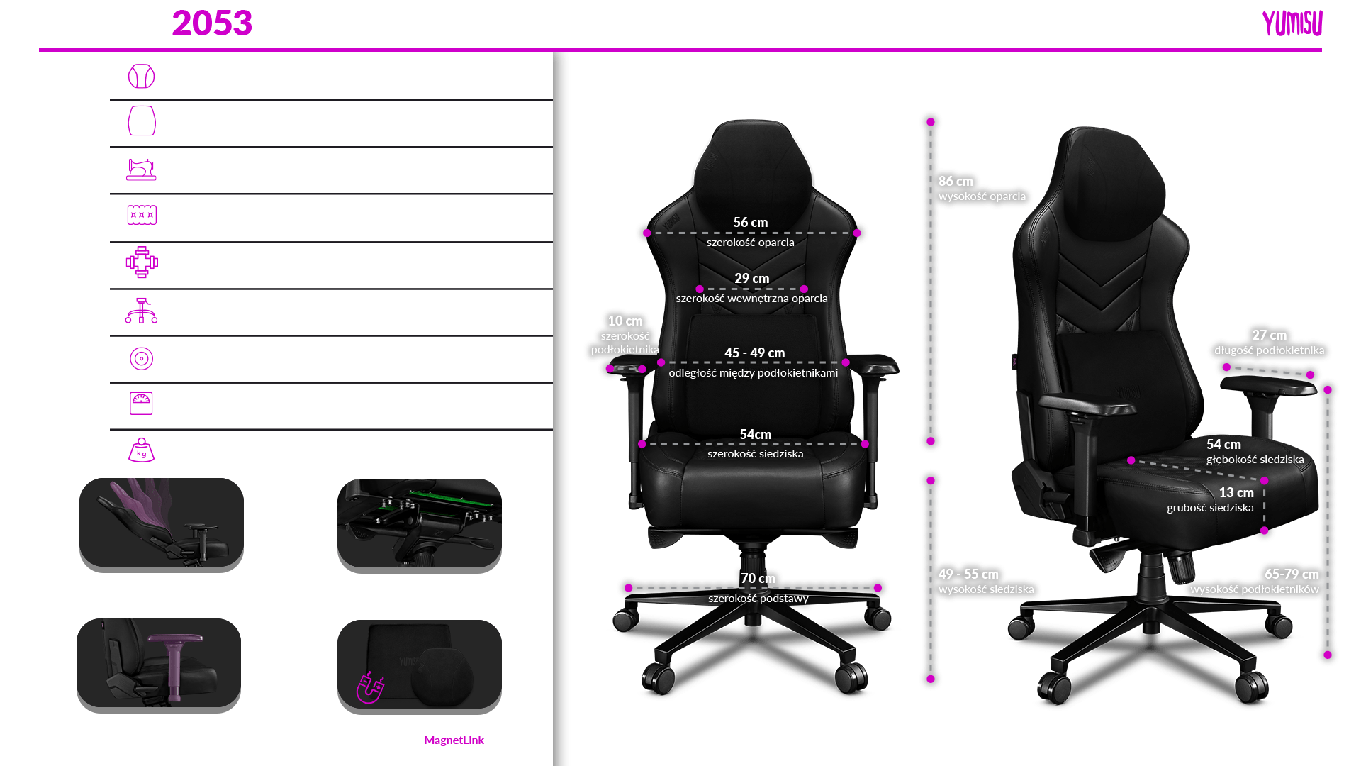 Ten fotel zachwyca od pierwszego wejrzenia. Spójrz tylko na design Yumisu 2053. Na elegancję zawartą w każdym elemencie, na kunszt wykonania, który widać gołym okiem. A gdy na nim siądziesz, poczujesz się błogo. Szerokie siedzisko pozwala rozsiąść się wygodnie. Solidne oparcie odciąża plecy. Regulowane magnetycznie poduszki wprowadzają szczyptę luksusu, która przyjemnie współgra z wykończeniem ze skóry syntetycznej. Tu zaczyna się nowa jakość.