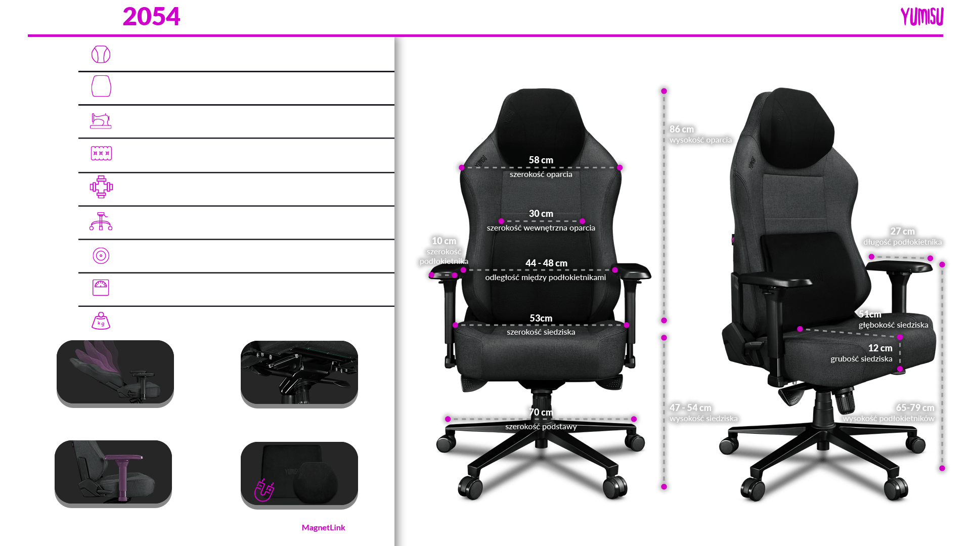 MagnetLink, innowacyjna technologia marki Yumisu, rewolucjonizuje doświadczenie związane z montażem poduszek pod głowę, odcinka lędźwiowego oraz maskownic fotela. Dzięki niezwykłej mocy magnetycznej, łatwo dostosujesz pozycję poduszek, zapewniając sobie niezrównany komfort ergonomiczny. Umiejscowienie maskownic odbywa się bez użycia narzędzi, co sprawia, że cały proces jest niezwykle prosty i szybki. To nie tylko funkcjonalność, to także wyraz prostoty i elegancji. Jako pierwsza firma na polskim rynku, Yumisu wprowadziło tę innowacyjną technologię, podkreślając swoje zaangażowanie w tworzenie produktów, które nie tylko spełniają, ale przede wszystkim przewyższają oczekiwania użytkowników.
